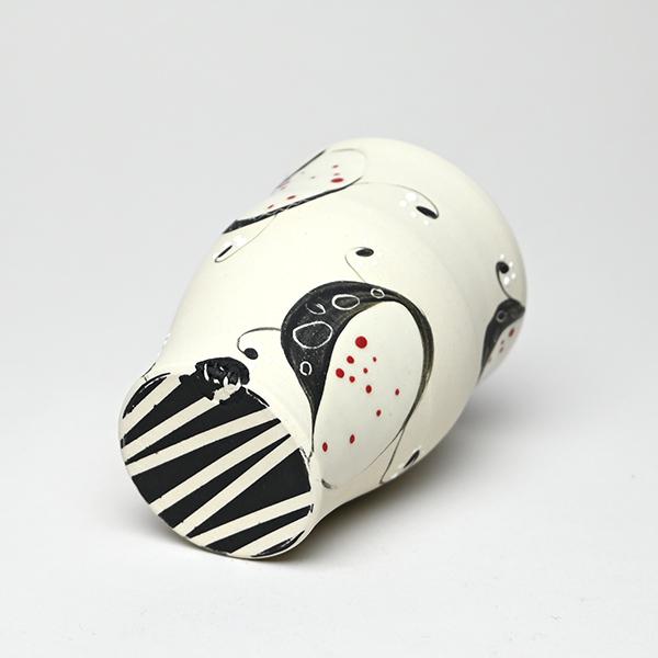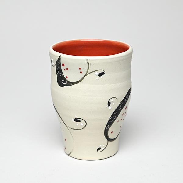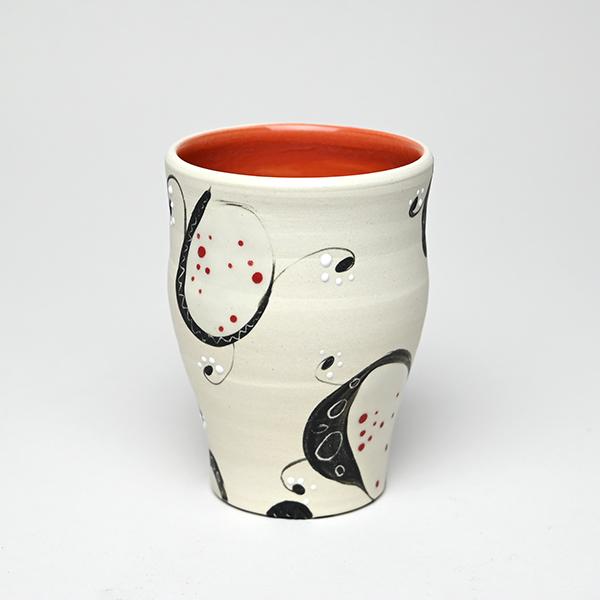 Flat-bottomed cup with brushwork and glaze dot details; tomato red interior.