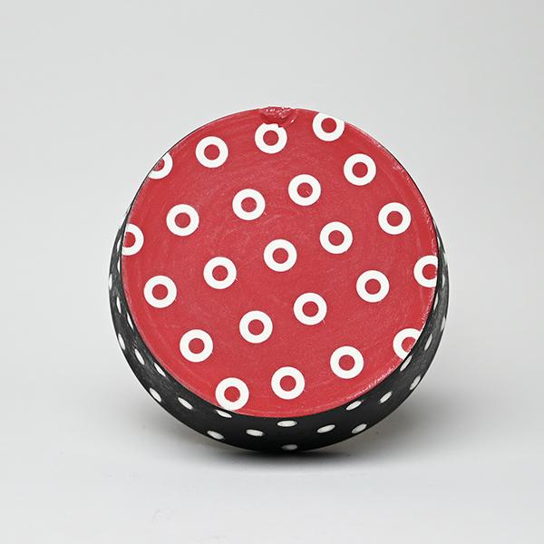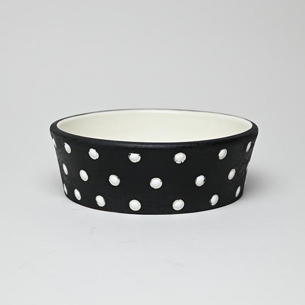 Jet black with white riveted polka dots.